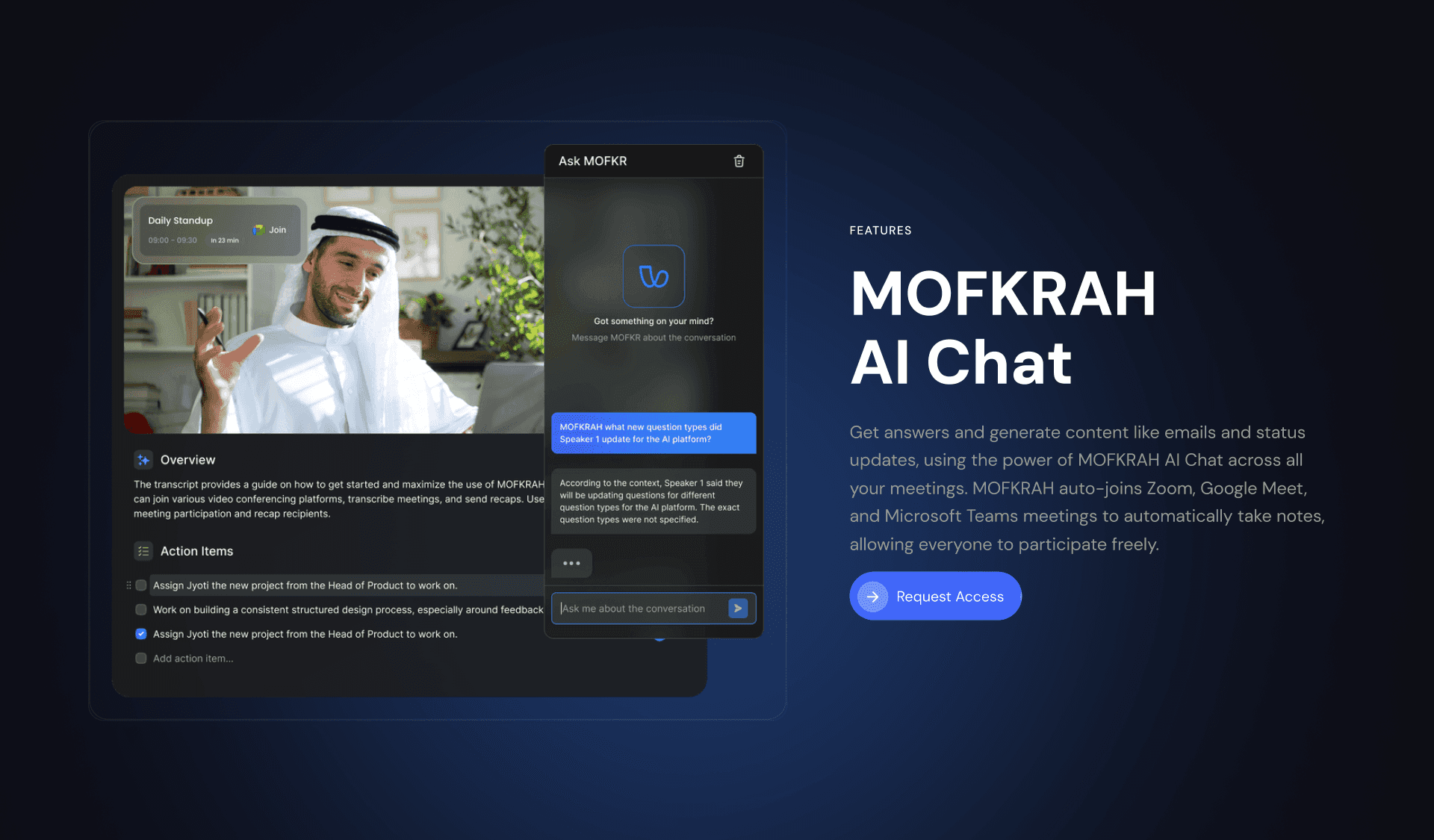 Mofkrah is an AI-powered meeting assistant that transforms discussions into structured, actionable insights. The platform needed comprehensive Arabic localization and UX improvements to serve bilingual users across the Middle East market.